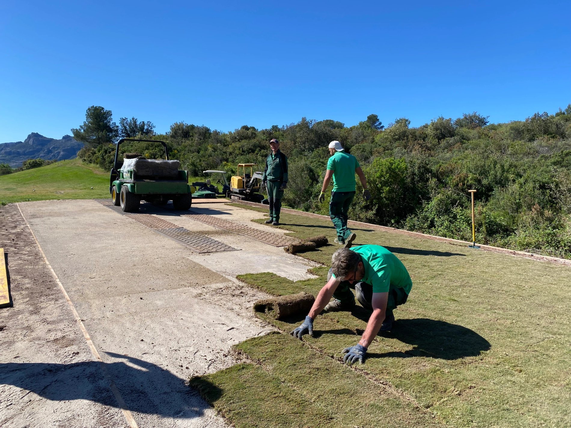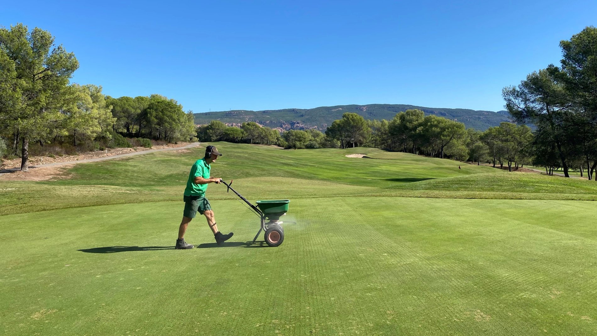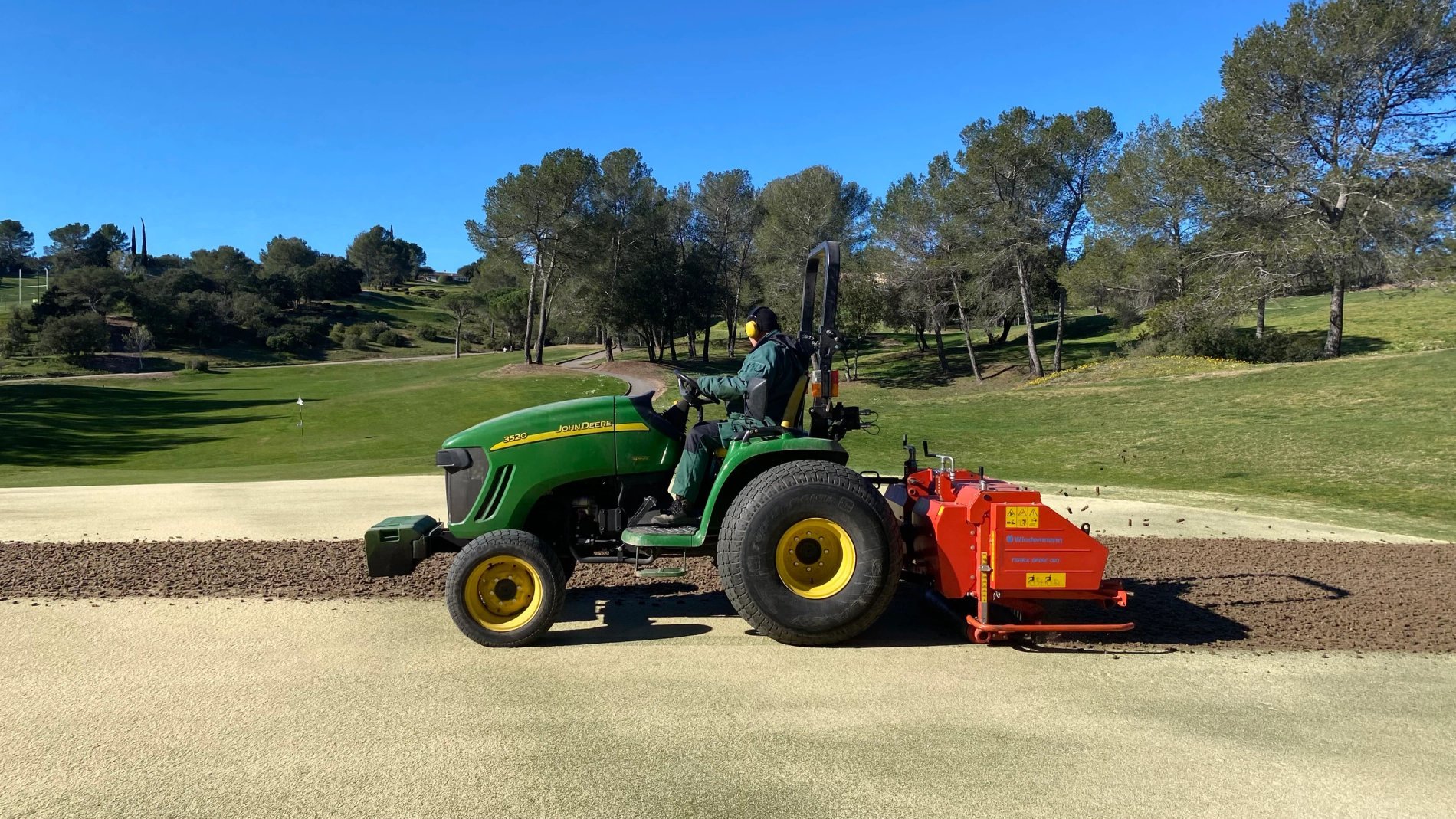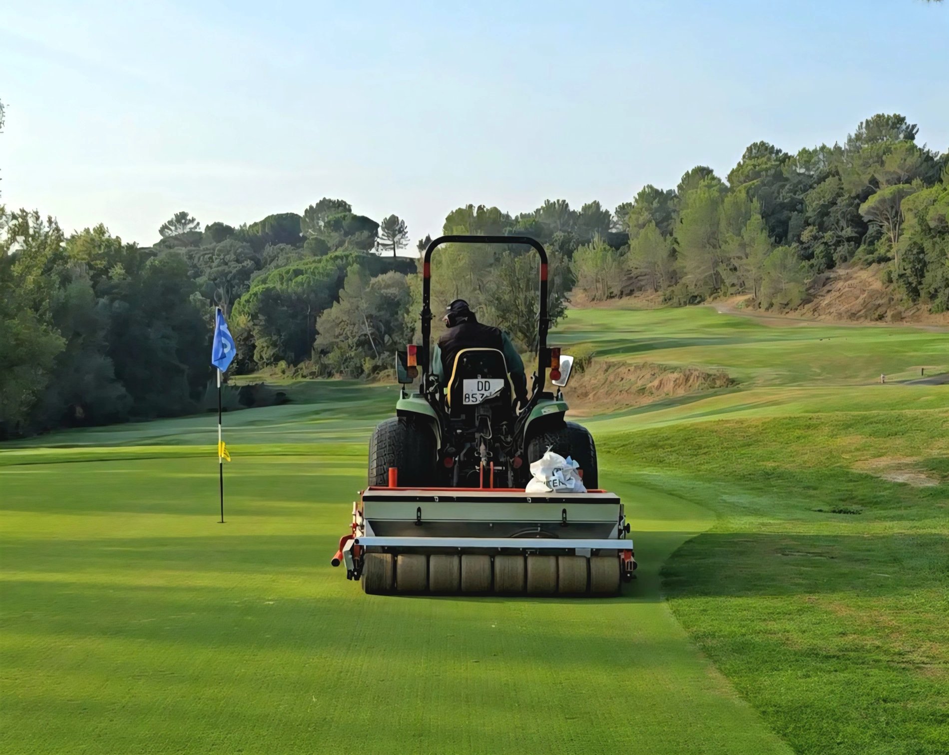CONSISTE À SEMER UN MÉLANGE DE GRAMINÉES SÉLECTIONNÉES À L’AIDE D’UN MATÉRIEL À POINTES QUI PERMET D’INSÉRER LES GRAINES DANS LE SOL AFIN DE FAVORISER UNE REPOUSSE HOMOGÈNE DU GREEN