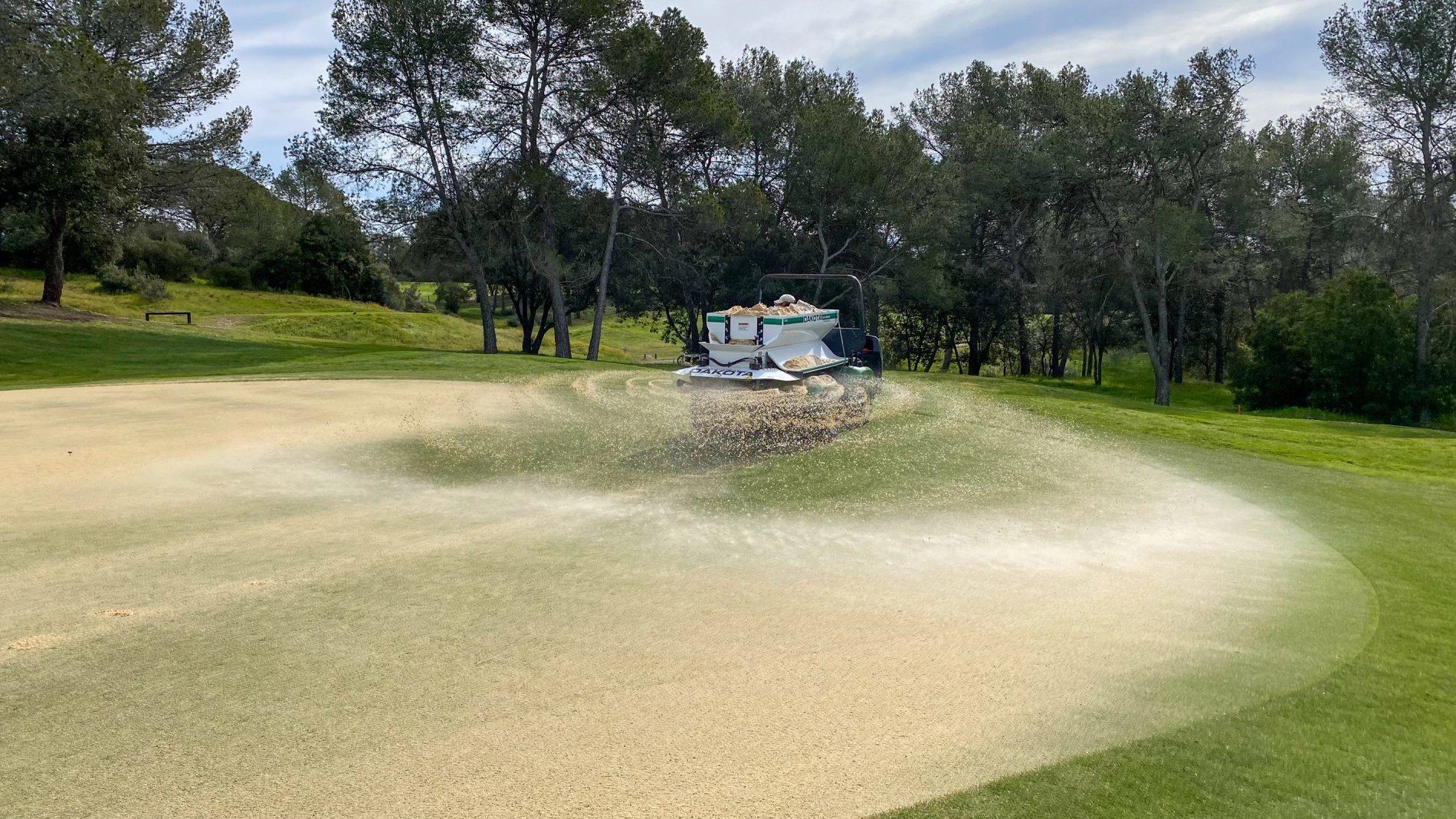 APPLICATION D'UNE FINE COUCHE DE SABLE SUR LES GREENS AFIN DE COMBLER LES PERFORATIONS