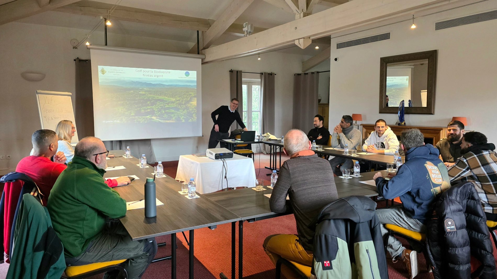 Une journée de sensibilisation a été animée par le directeur du CPIE des Îles de Lérins et Pays d’Azur. L'objectif est de permettre au personnel de s’approprier les enjeux du label et de comprendre les interactions entre biodiversité et pratiques professionnelles. La matinée a été consacrée à la présentation de l’étude naturaliste et des recommandations associées. L’après-midi s’est déroulée sur le parcours, avec l’observation des habitats, des espèces et des pratiques de gestion, afin de relier concrètement les enjeux de biodiversité au fonctionnement quotidien du site. Cette journée a permis de renforcer la compréhension commune et l’engagement du personnel en faveur d’une gestion du golf plus respectueuse de la biodiversité.